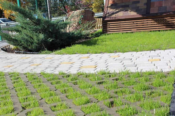 Благодаря разности высот и свободному проникновению влаги такое решение позволяет защищать растения от вытаптывания и повреждения колесами автомобилей, а кроме того – гармонично соединяет чистоту территории с естественностью.